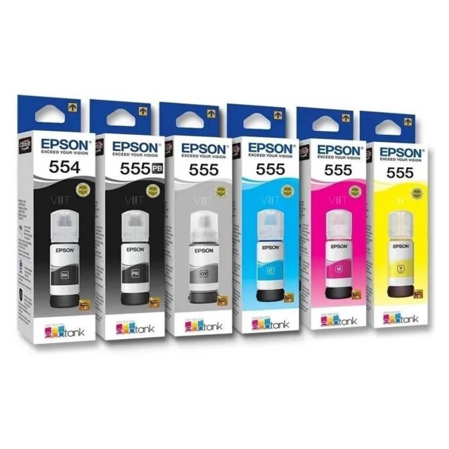 El set T555 incluye cian, magenta, amarillo y negro para lograr imágenes vibrantes y textos definidos, mientras que la tinta T554 complementa con un negro adicional que aporta mayor intensidad y rendimiento. El resultado: páginas más claras, colores más vivos y una calidad que se nota desde la primera impresión.